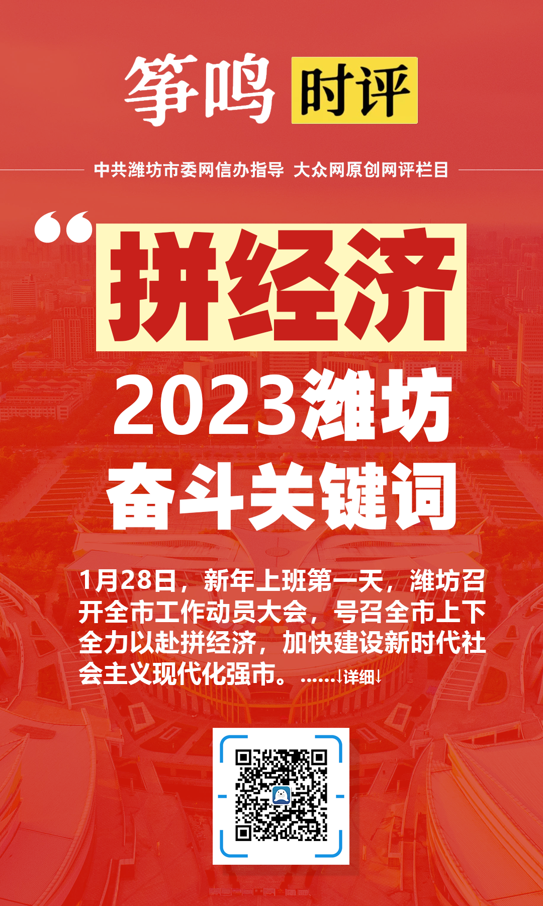 1月28日,新年上班第一天,濰坊召開全市工作動員大會,號召全市上下全力以赴拼經(jīng)濟(jì),加快建設(shè)新時代社會主義現(xiàn)代化強(qiáng)市。